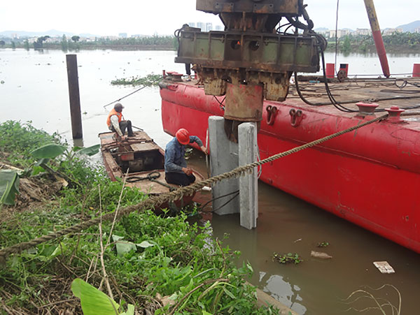 據(jù)悉,施工人員試樁前發(fā)現(xiàn),按照設(shè)計(jì)圖紙放線的水面下方存在原有的堤防基礎(chǔ),為防出現(xiàn)斷樁及板樁傾斜等情況,遂提出岸線外移的要求。經(jīng)各方現(xiàn)場考察、比對施工圖紙后,決定按圖紙定位先行試樁,若確實(shí)無法沉樁,再決定實(shí)施變更方案。在施工人員同監(jiān)理人員沉穩(wěn)的操作與監(jiān)督下,經(jīng)過大約30分鐘第1條U型板樁已沉樁至圖紙要求的高程處。各方在觀看沉樁試驗(yàn)后提出了以下幾點(diǎn)建議:一是按圖紙要求定位是可以沉樁的,要求施工方按圖紙施工放樣;二是為保證沉樁時(shí)樁的垂直度及樁與樁之間結(jié)合的緊密度,要求底部安裝圍檁架;三是沉樁時(shí),震動偏大,建議使用高頻低震錘,特別是靠近居民區(qū)附近;四是為避免沉樁過程中樁身擺動,要求樁頂加設(shè)緊固設(shè)施;五是為保障安全文明施工,要求堤頂現(xiàn)有的、影響施工的低壓線路盡可能的遷移。施工方在聽取各方提出的建議后,認(rèn)真總結(jié)、積極改進(jìn),爭取保質(zhì)保量的完成施工任務(wù)。